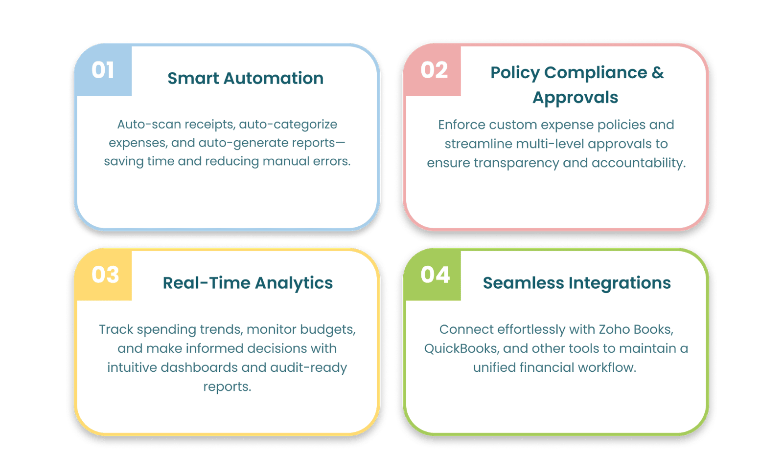 Zoho Expense simplifies expense management by offering smart automation, intuitive design, and powerful tracking tools—all in one place. From scanning receipts and enforcing policies to managing approvals and generating audit-ready reports, it helps businesses stay efficient and compliant. With real-time analytics, automated workflows, and seamless integrations, Zoho Expense is built to scale with your growth while keeping your spending crystal clear.