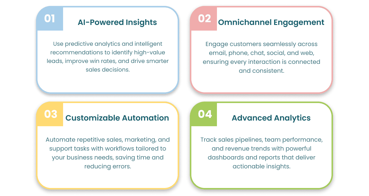 to help businesses grow smarter and faster. Designed with AI-driven insights, omnichannel engagement, and automation, it enables teams to manage leads, close deals, and build lasting customer relationships with ease. Whether you’re a startup or an enterprise, Zoho CRM streamlines processes, improves collaboration, and drives measurable growth.
